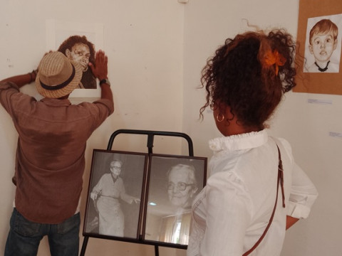 Rostros dibujados y pintados con tinta de granos de café, sobre yute y cartulina, por el artista visual autodidacto guantanamero Eliardo del Toro Brines, son apreciados por primera vez por los participantes en el XI Congreso Iberoamericano de Ingeniería de Proyectos (CIIP 2023), en el Centro Cultural Dulce María Loynaz, en La Habana.